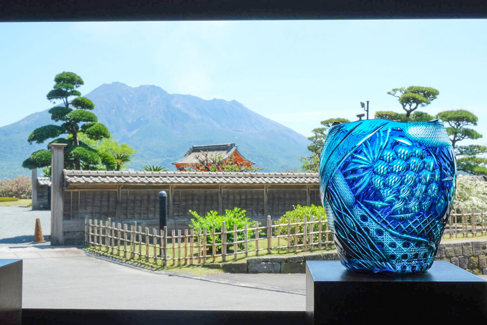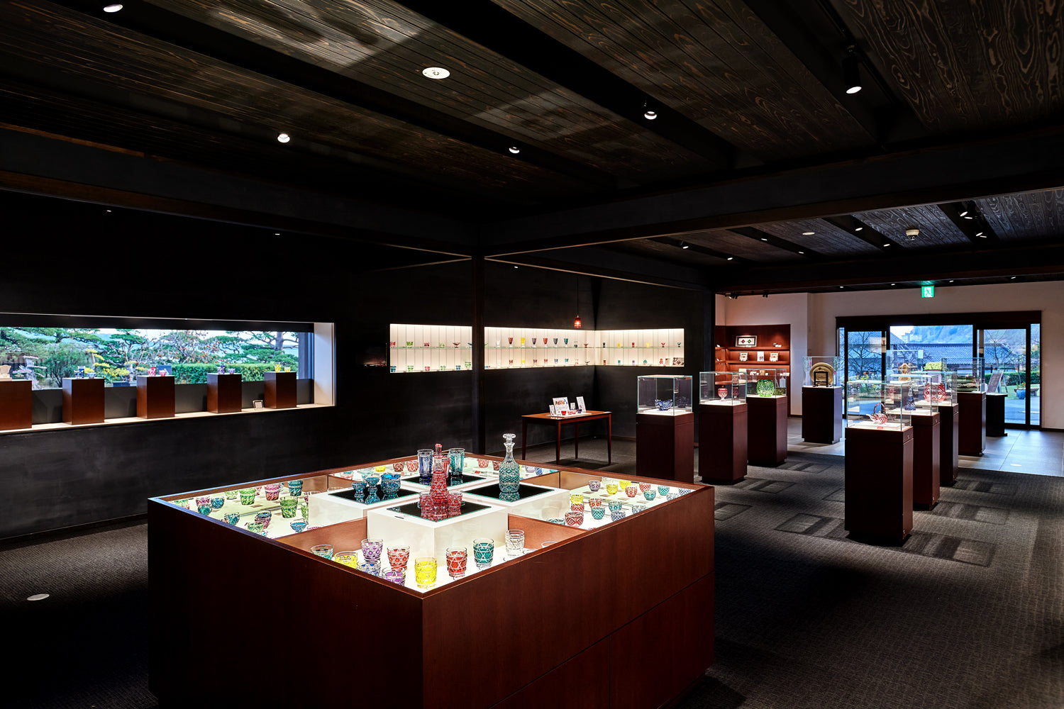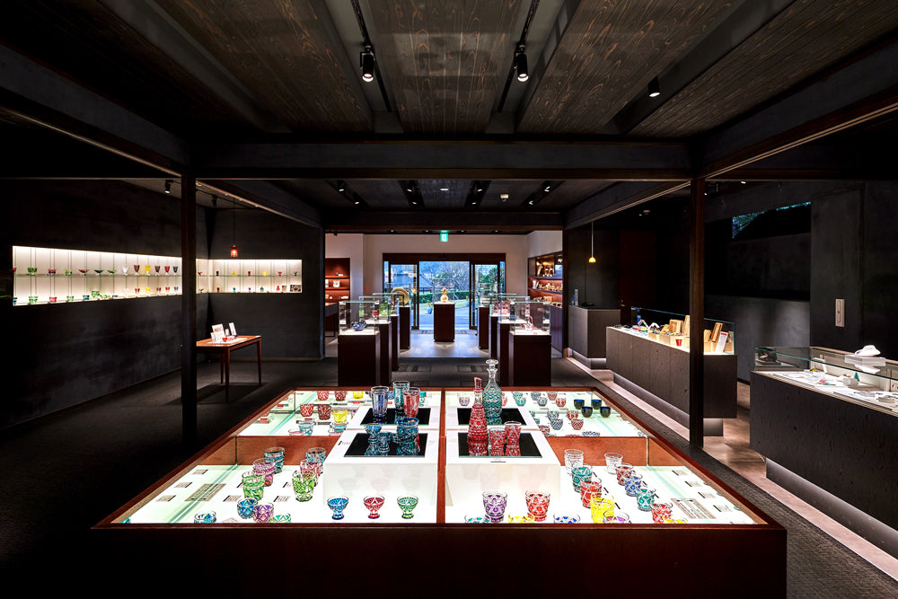 直営店ならではの豊富な種類の薩摩切子が並ぶ店内。