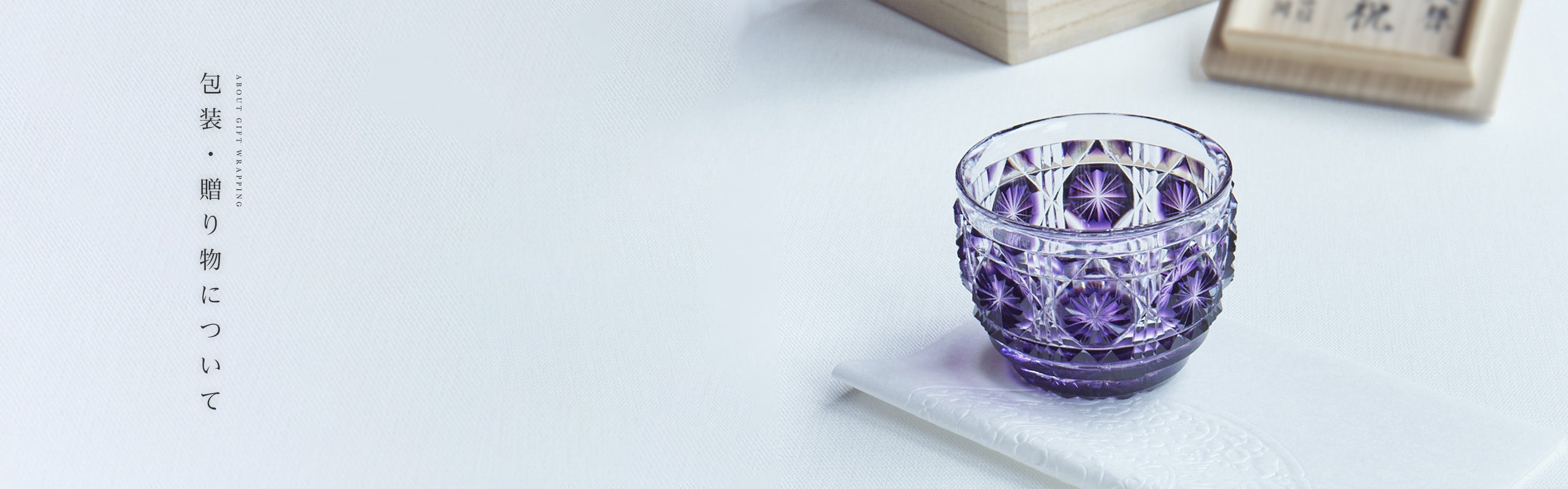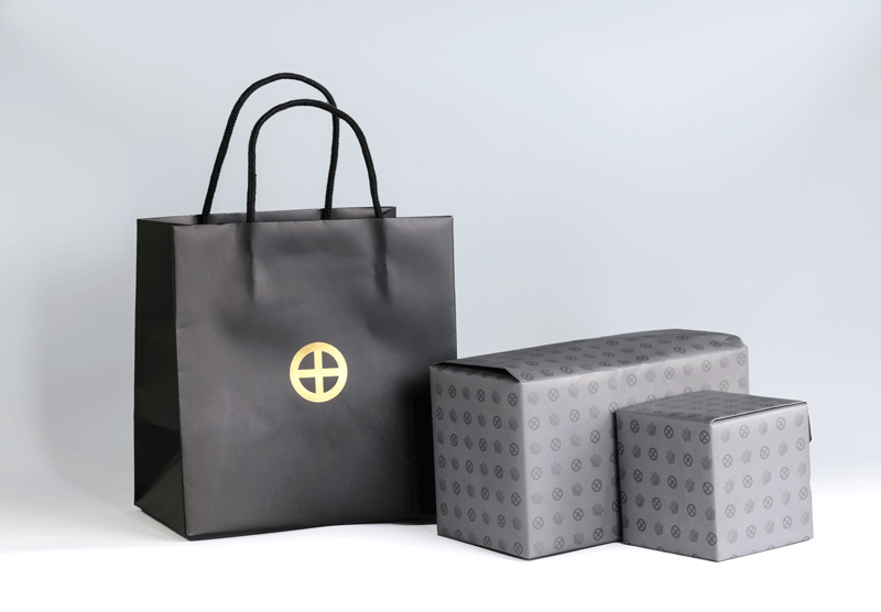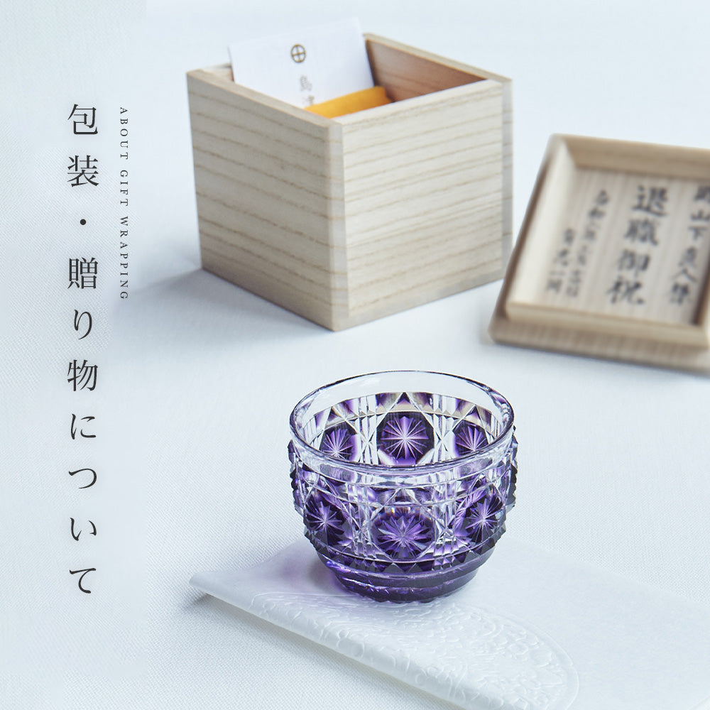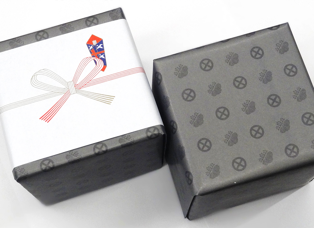島津薩摩切子ギャラリーショップの包装は、島津家の家紋である丸十紋と桐紋を配したオリジナル包装を使っております。