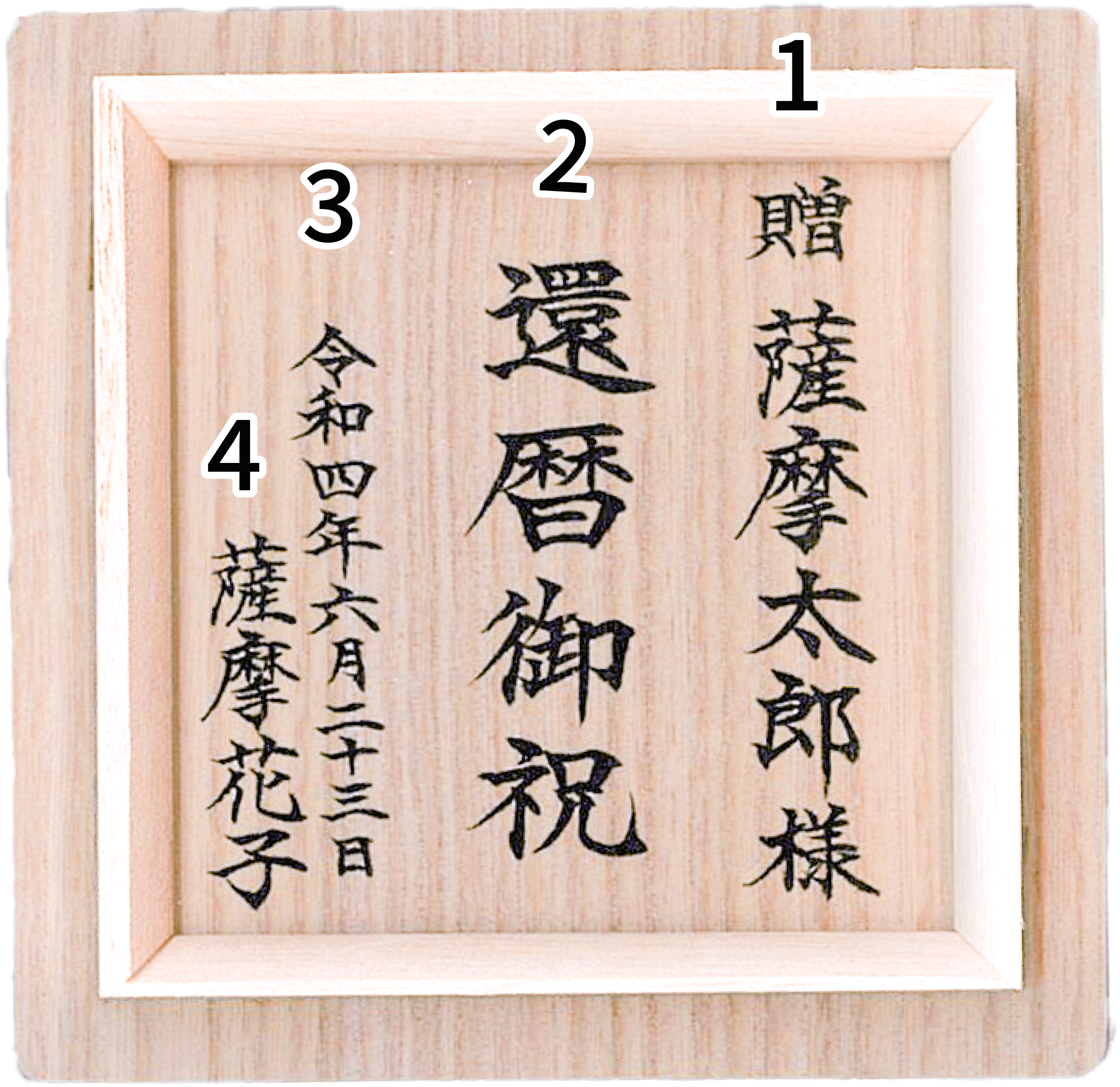 ご注文の際「熨斗・箱書きを希望」にチェックを入れていただき、箱書き①~④へお名前や記念の言葉などをご入力ください。