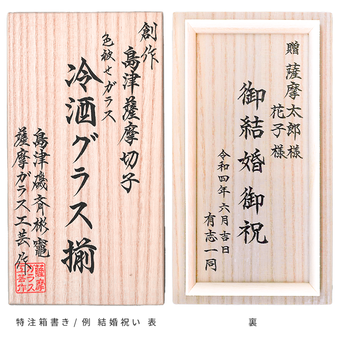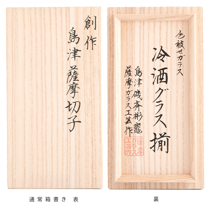 通常は桐箱の蓋、表と裏に『島津薩摩切子/商品名/製作元/落款』が記されています。