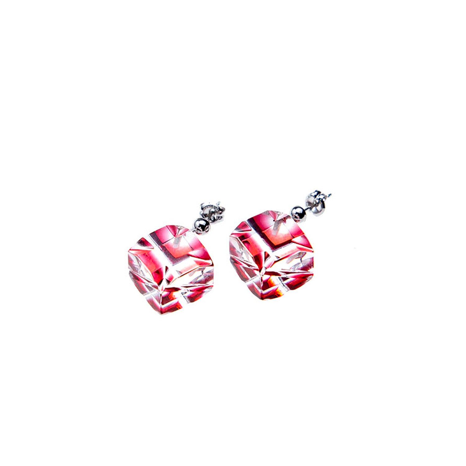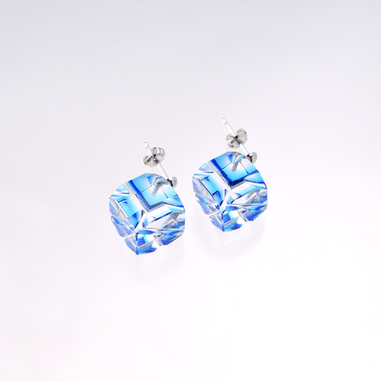 立方体なので“揺れる”形状の面白さを活かし、色被せされていない面にもカットを施し、映り込みが変化する表情の面白さと奥行き感を楽しんでいただけるようデザインしています。