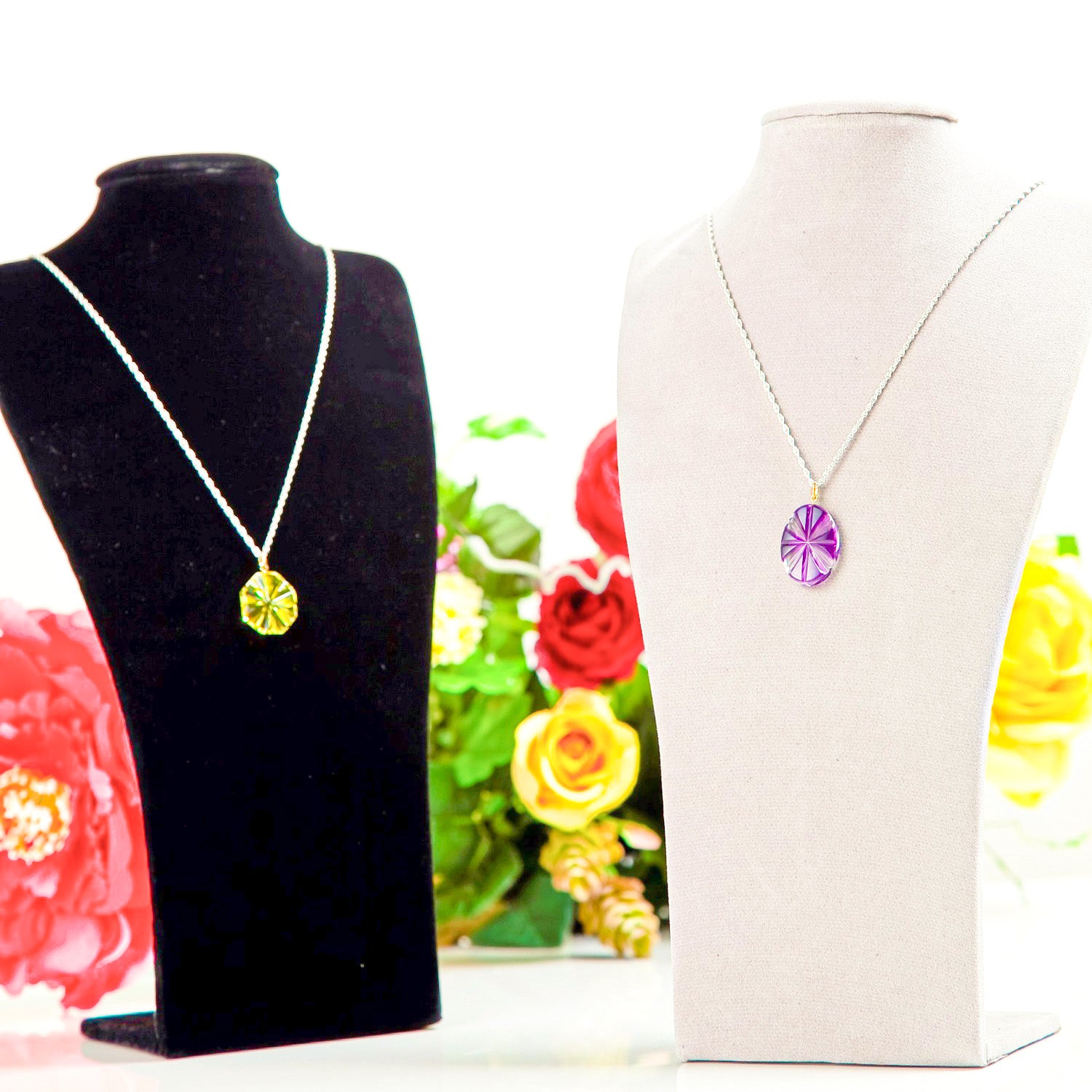 また、色ガラスの部分を多く残したデザインになっているので、胸元でゆれる鮮やかな色彩をお楽しみいただけます。