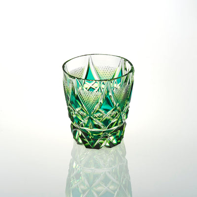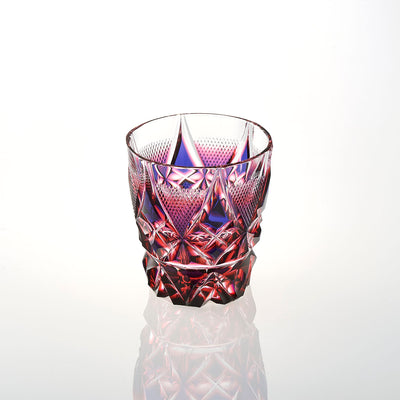 今までの島津薩摩切子は口元の色ガラスを削り取り、その下に段差を付けて色ガラスを残していますが、本作では口元から色被せの文様にカットが繋がっており、魚子文のなかに二色のグラデーションを繊細に表現しました。