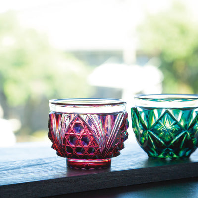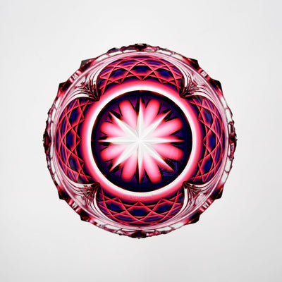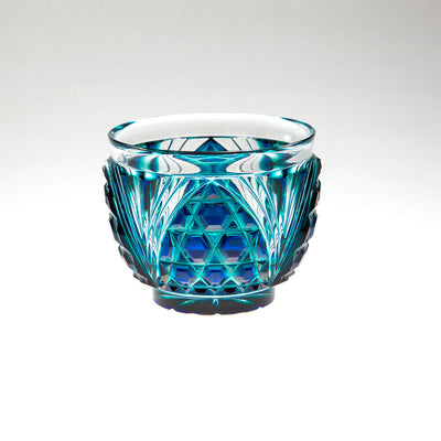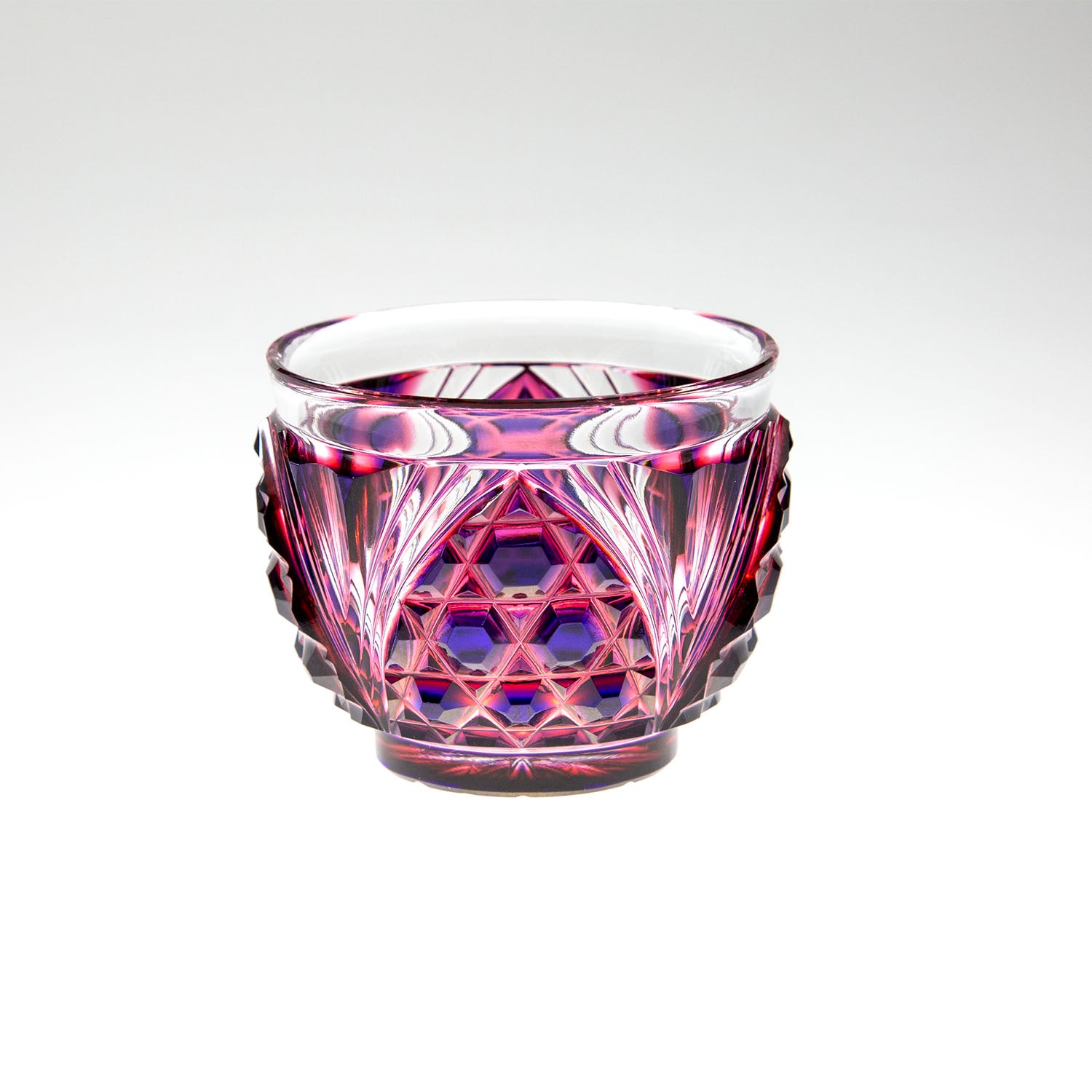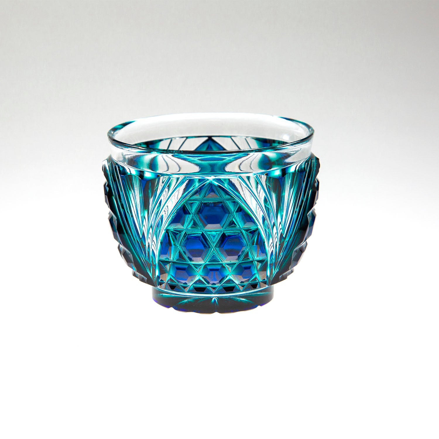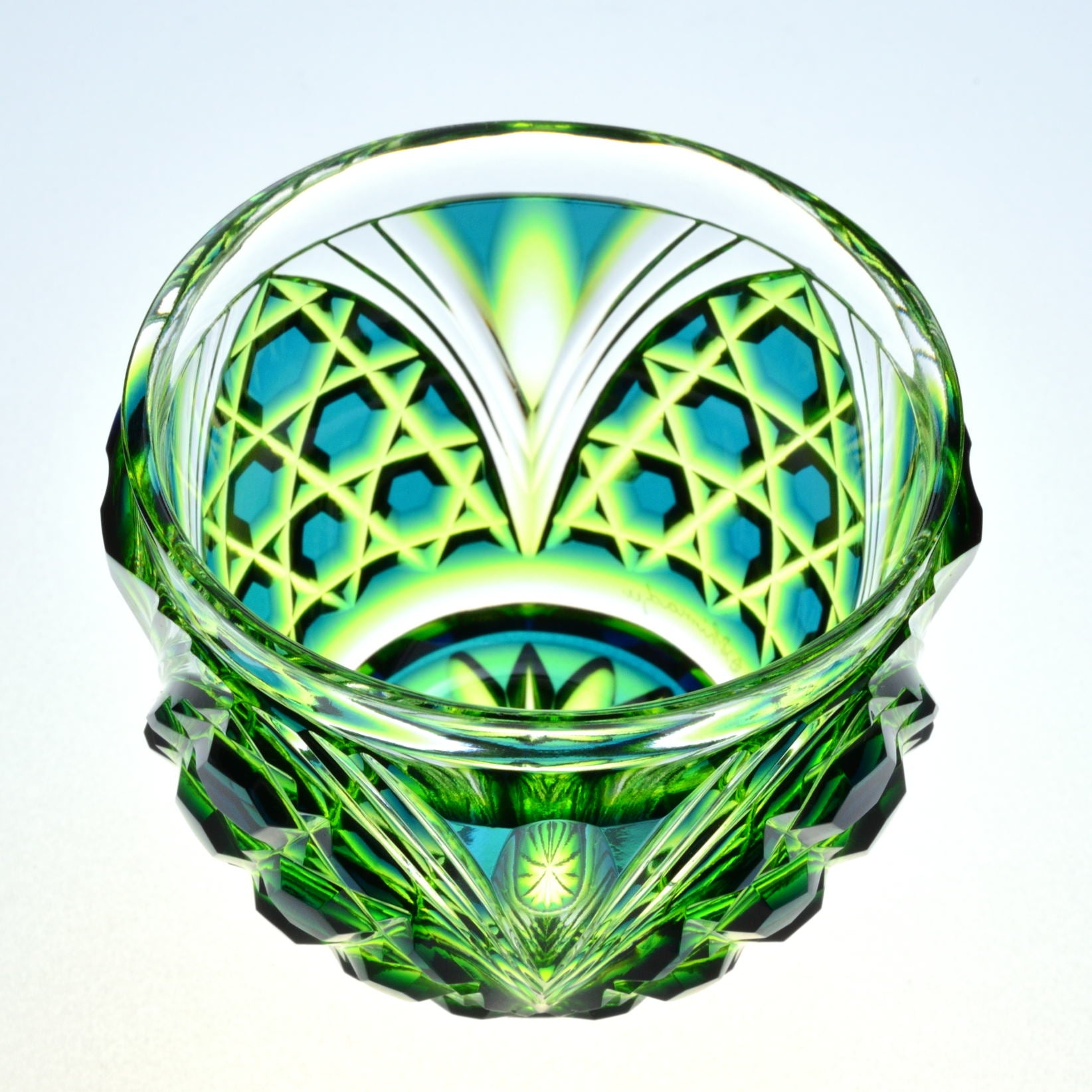 側面には4弁の花弁のように色を残し、その中に伝統的な六角籠目紋を施しました。単色とはまた違う趣で、聖堂のステンドグラスを思わせます。