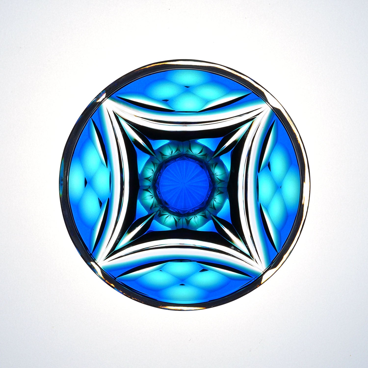他の器同様に、脚の底にもカットが施され脚の胴部分から覗いて見えますが、底の色ガラスを多く残し、ここでも二色ならではの深いぼかしをお楽しみいただけます。