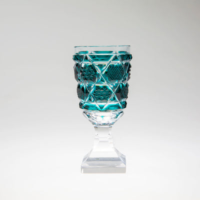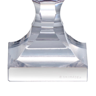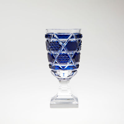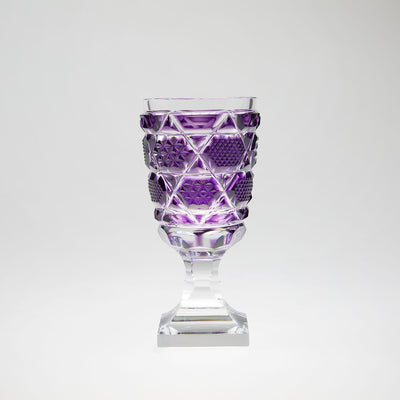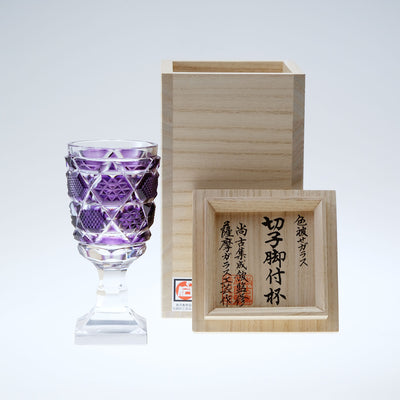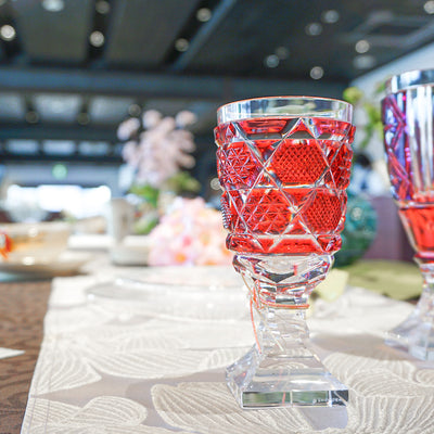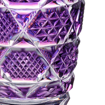 ボウルには六角籠目文に麻の葉文と魚子文を交互にあしらい、その上下の台形のカットには色ガラスと透明ガラスの際ぎりぎりまで彫り込んだ“ぼかし”が表現されています。
