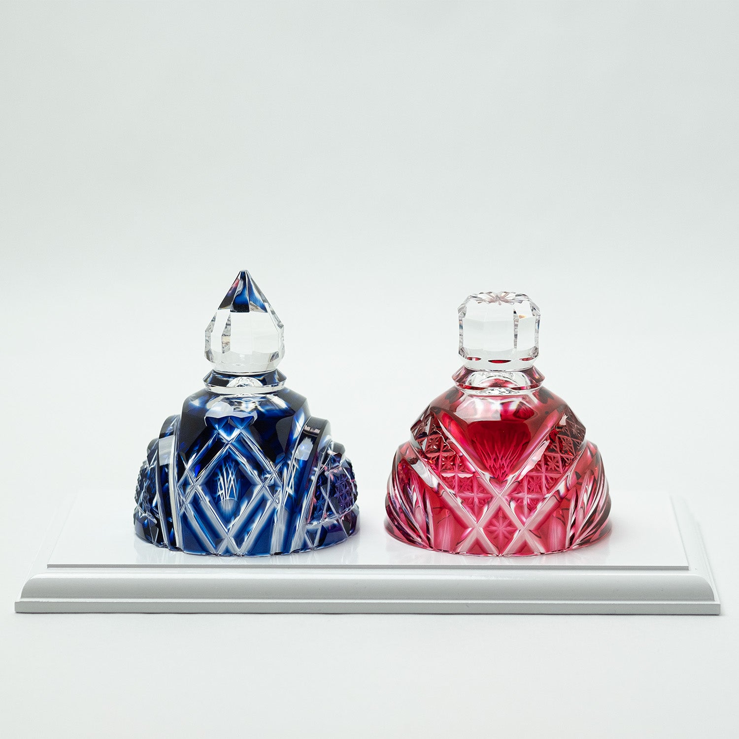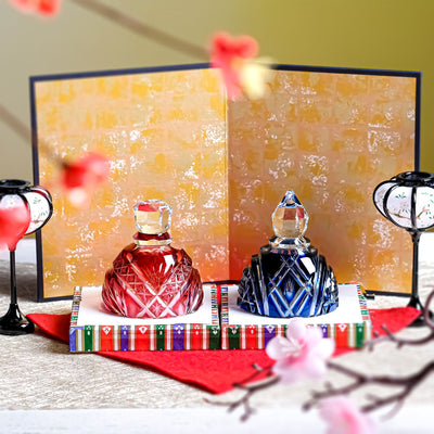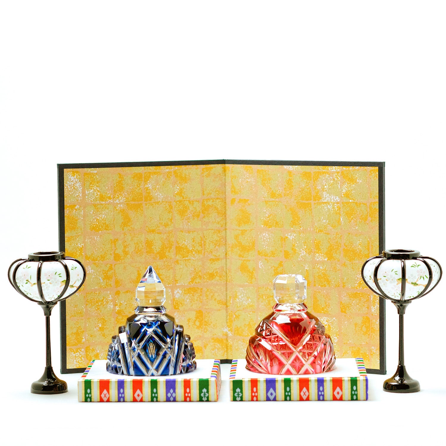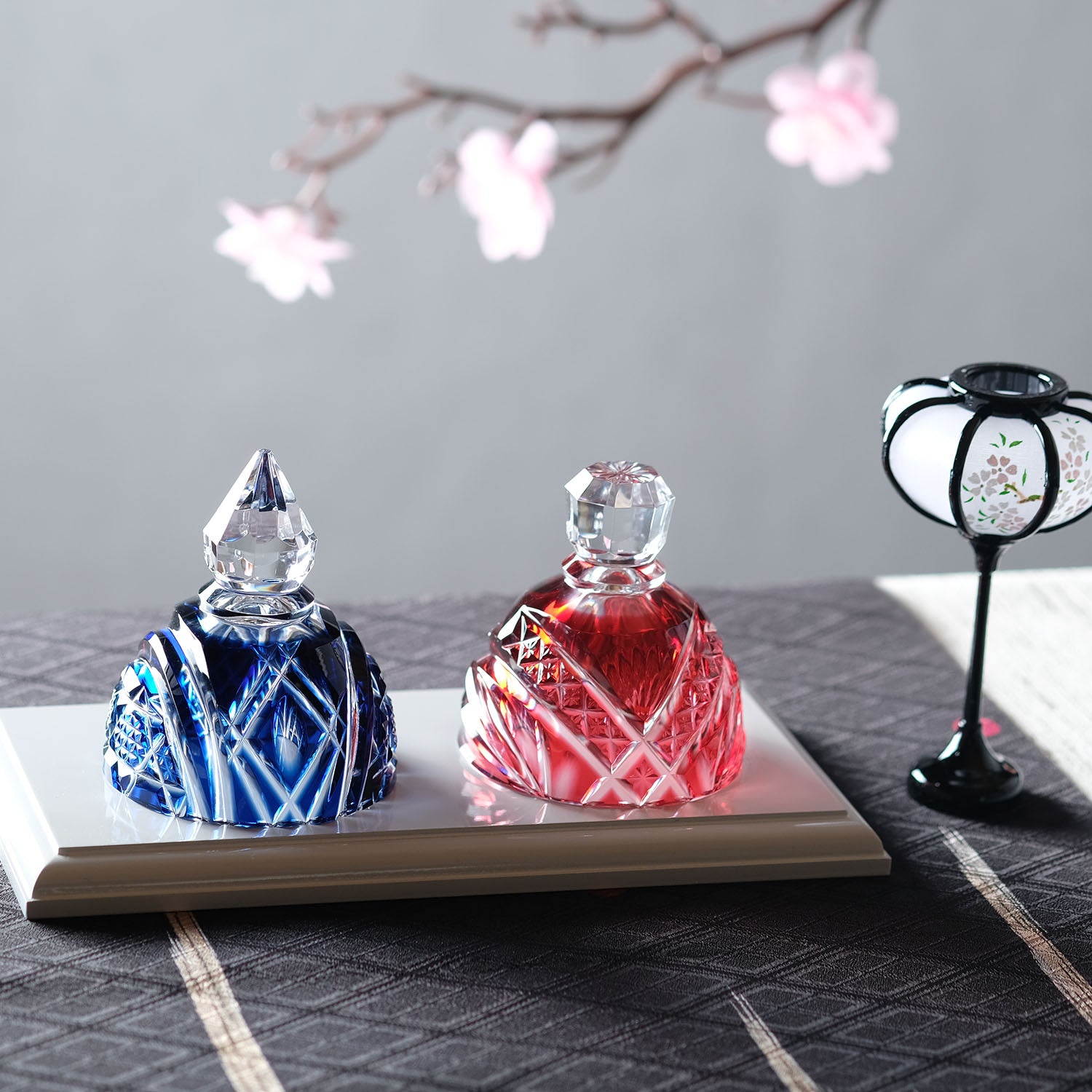 (セット内容:切子雛(藍・金赤)・台座・屏風・ぼんぼり・畳・毛氈・桐箱)