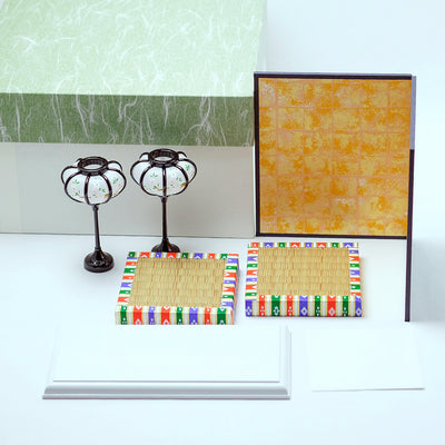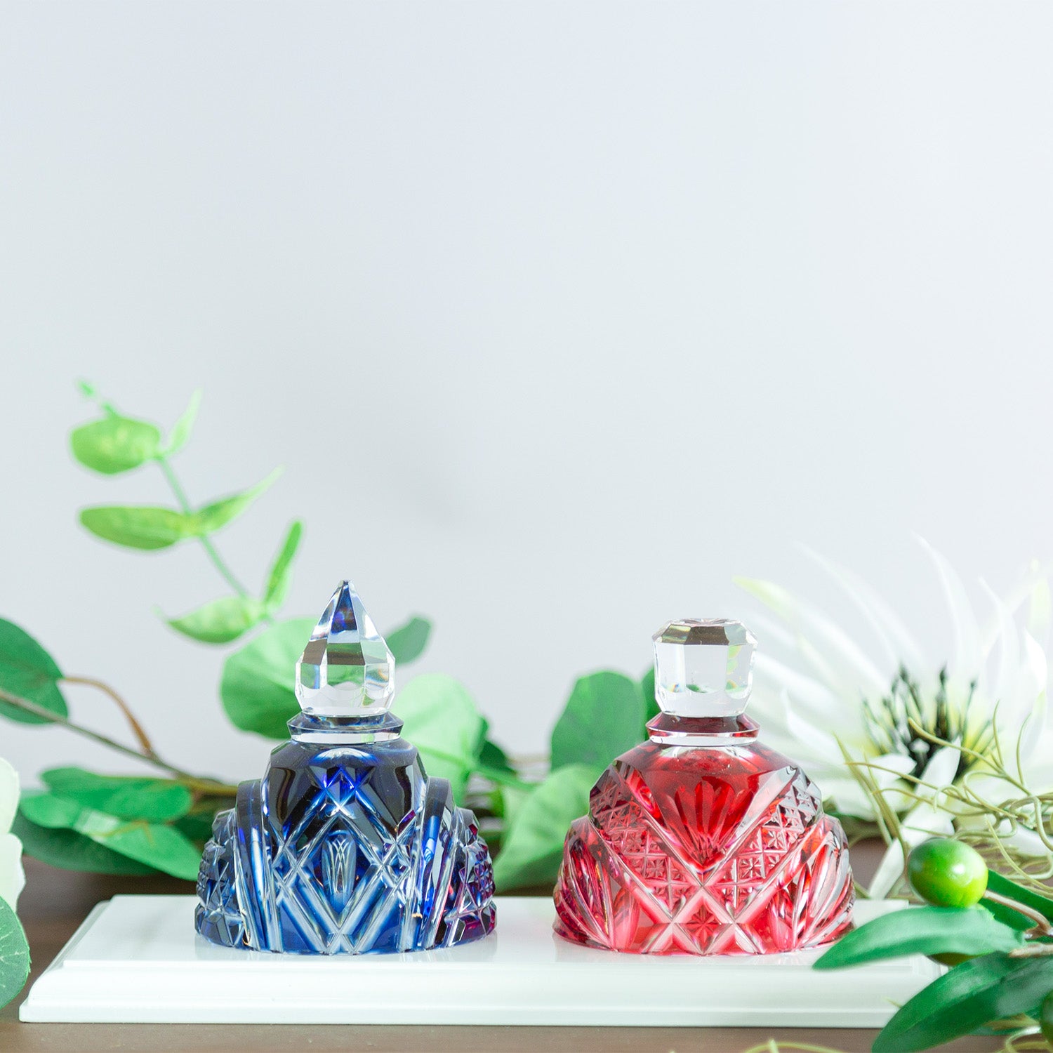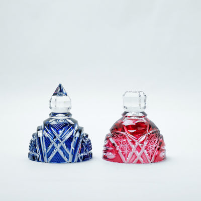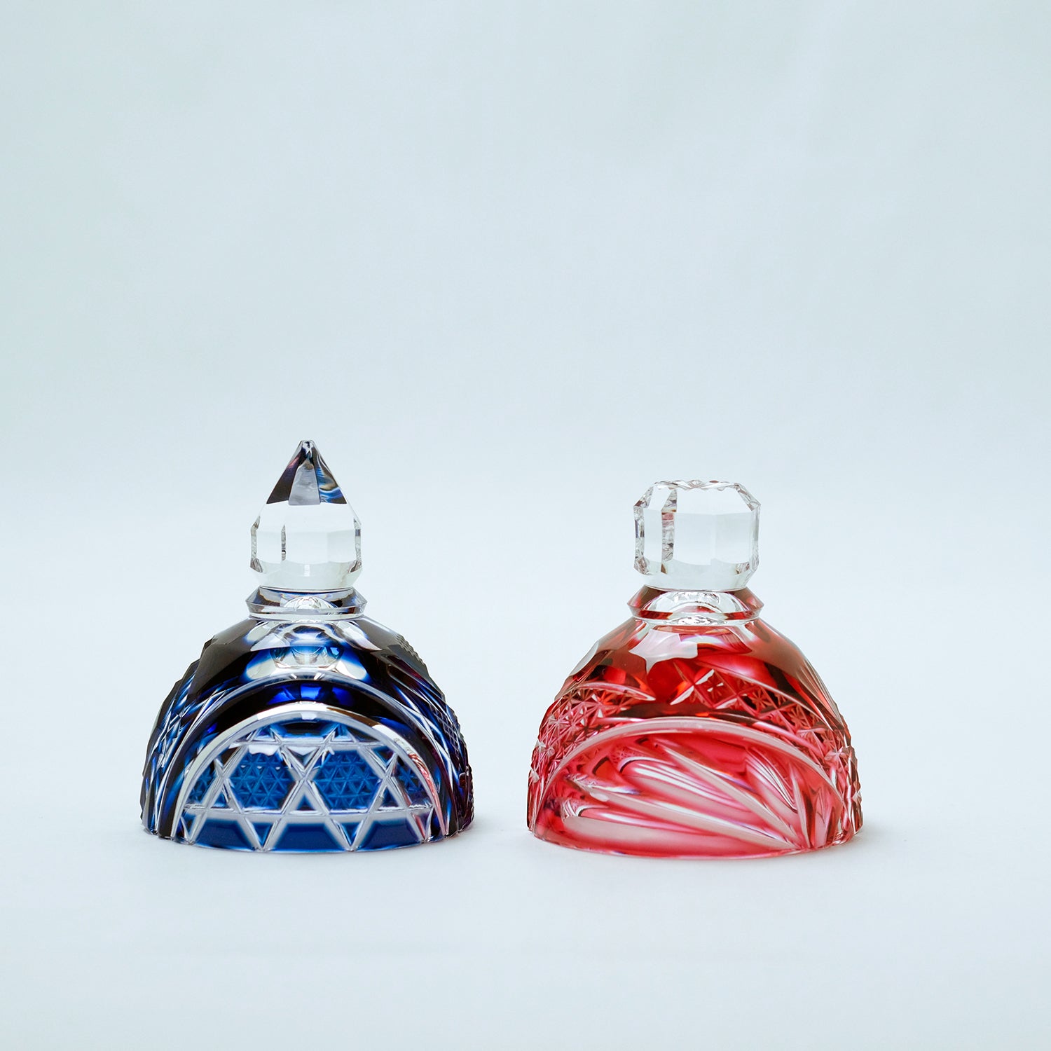 (セット内容:切子雛(藍・金赤)・台座・屏風・ぼんぼり・畳・毛氈・桐箱)