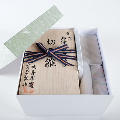 (直営店とオンラインショップを除く取扱店の場合、セット内容は切子雛(藍・金赤)・台座・毛氈を桐箱にパッケージいたします。価格は取扱店にお問い合わせください)