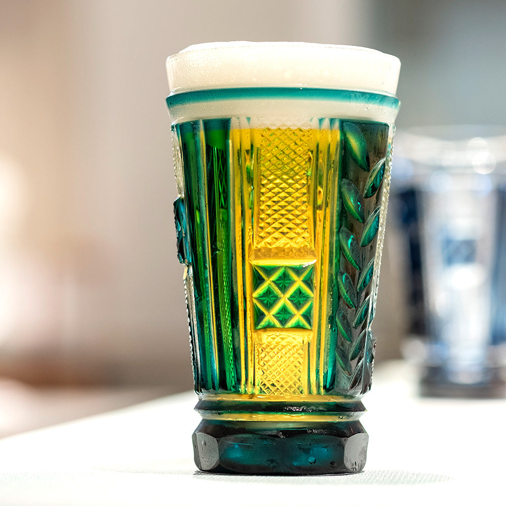 お酒の色やビールの泡といった中身も楽しめるよう、職人のこだわりが表現されています。